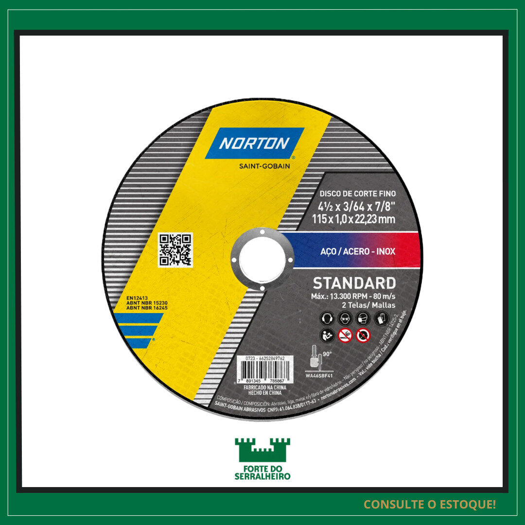 O disco Norton 4 1/2” Standard é uma das melhores opções do mercado para corte de metais em geral, sendo muito utilizado em serralherias, oficinas, manutenção industrial e construção civil. Fabricado com materiais de alta qualidade, proporciona corte rápido, preciso e seguro.